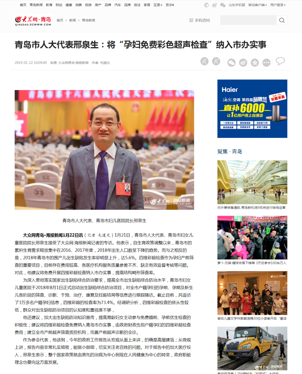 大众网:青岛市人大代表邢泉生:将“孕妇免费彩色超声检查”纳入市办实事
